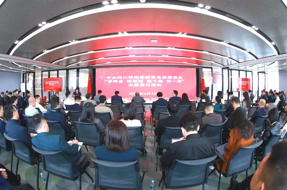 2025年4月7日下午,明炬党委开展“学两会 明规矩 鼓干劲 创一流”主题党日活动。本次活动由明炬党委书记王宗旗、副书记霍子诗共同主持,全体党员、入党积极分子、党员发展对象参加,管委会、执委会、监事会非党员成员,团委、团支部成员,民主党派人员,青年律师代表列席会议。成都市律师行业党委班子成员以普通党员身份参加了明炬的主题党日活动。