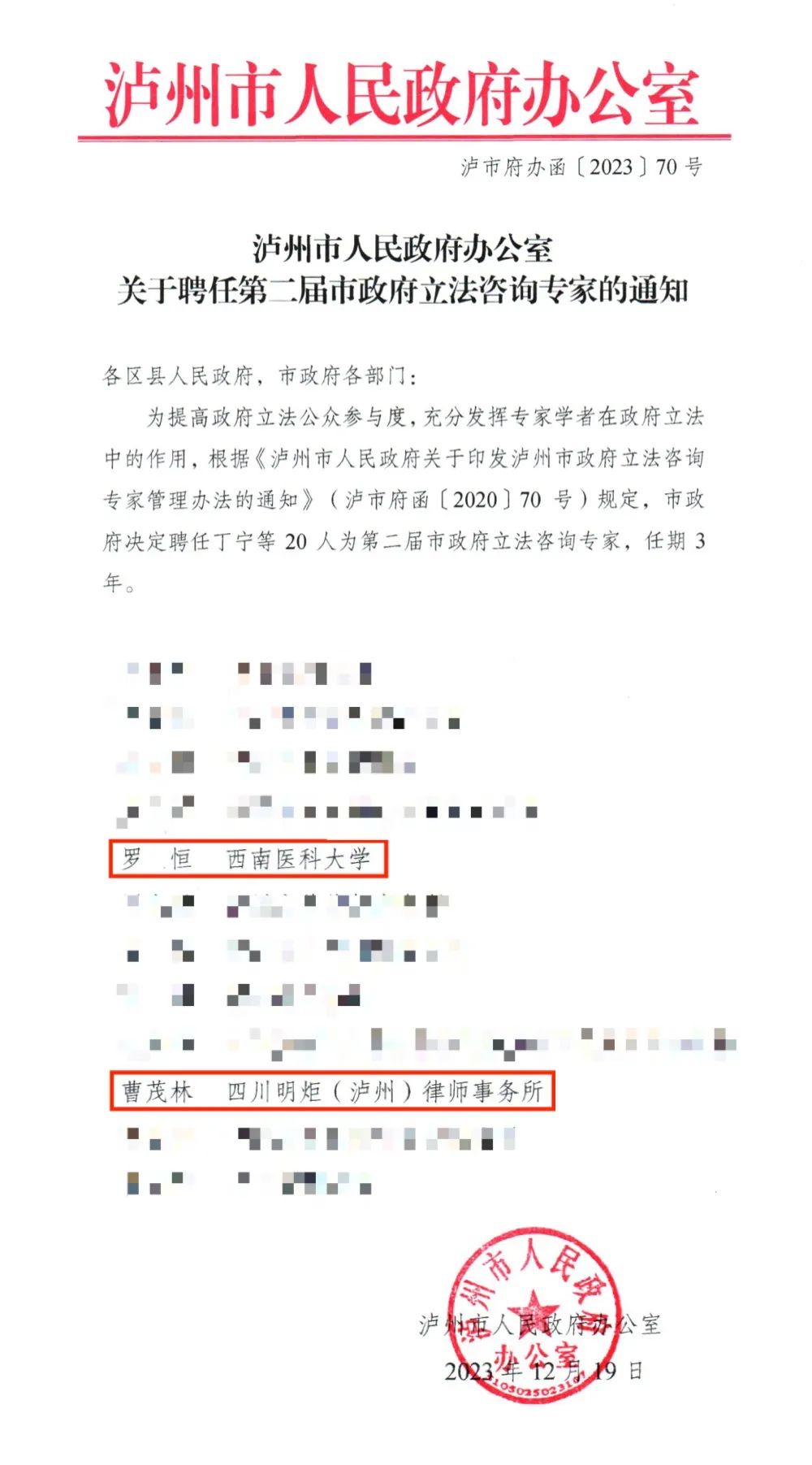 为提高政府立法公众参与度,充分发挥专家学者在政府立法中的作用,近日,泸州市人民政府下发了《泸州市人民政府办公室关于聘任第二届市政府立法咨询专家的通知》(泸市府办函〔2023〕70号),决定聘任明炬泸州分所曹茂林、罗恒律师等社会各界20人为第二届市政府立法咨询专家,任期三年。