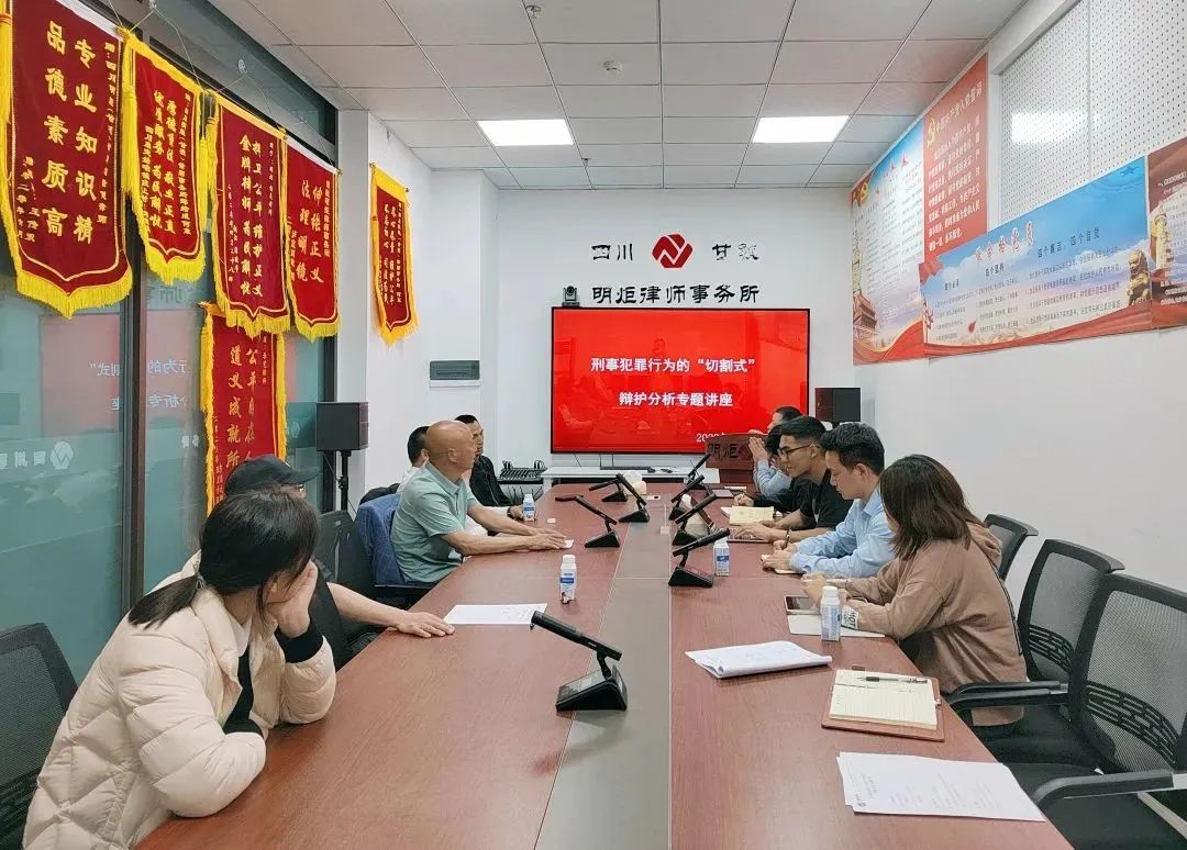 为提升刑辩技能,更好地为当事人服务,明炬甘孜分所启动了讲、学、练和新老律师互动交流相结合的培训模式。2023年7月24日,由谯龙律师主讲的“刑事犯罪行为的‘切割式’辩护分析专题讲座”在分所会议室成功举办。讲座由牟文林律师主持。