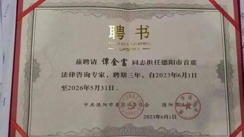在2023年6月29日召开的“法治德阳应用研究会”成立大会中,明炬什邡分所谭金富律师被中共德阳市委政法委员会、德阳市法学会聘为“德阳市首席法律咨询专家”,自2023年6月起聘期3年。