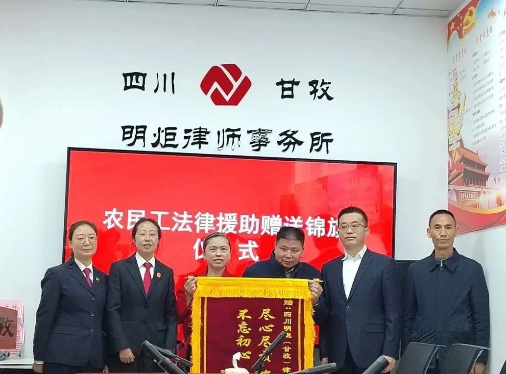 2023年5月8日,当事人王某代表8名农民工为明炬甘孜分所工会主席、管委会委员何东送来一面锦旗和一封感谢信,“尽心尽责 维护公平 不忘初心 司法为民”代表着对何东律师的诚挚感激。
