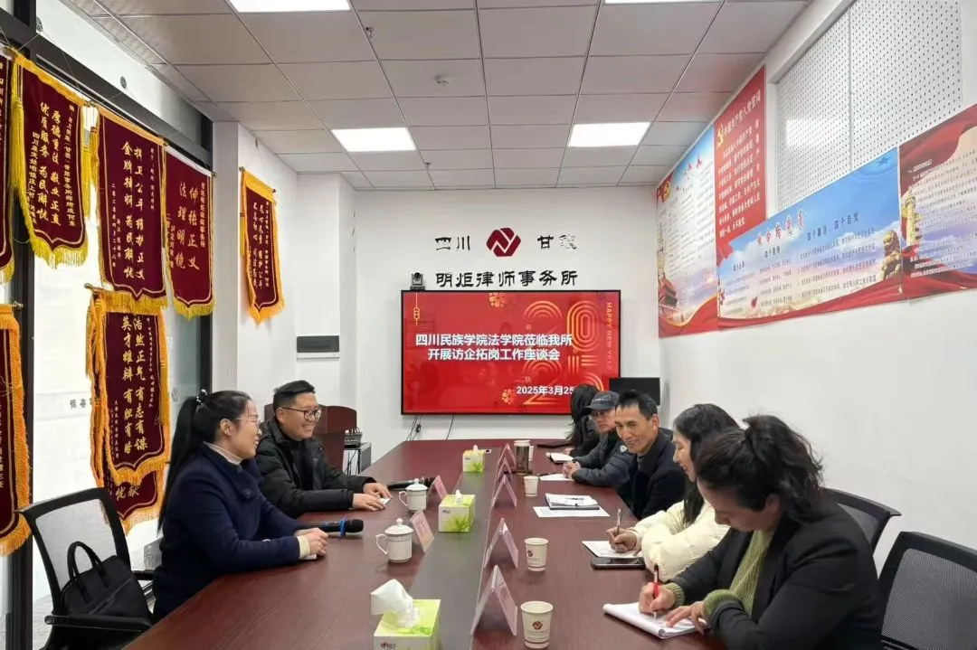 2025年3月25日上午,四川民族学院法学院党委副书记邹玉、学生科科长周清云赴明炬甘孜分所开展访企拓岗专项工作。双方通过深入交流共商法治人才培养大计,为构建校企协同育人机制奠定坚实基础。