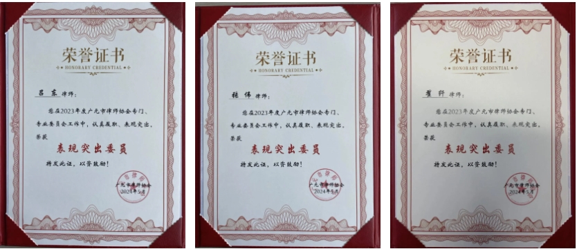 2024年5月24日,广元市律师协会公布了2023年度市律协专门、专业委员会表现突出的委员名单。明炬广元分所吕东、张伟、翟纤律师因在2023年度专门、专业委员会工作中的突出贡献和卓越表现,荣获“表现突出委员”称号。