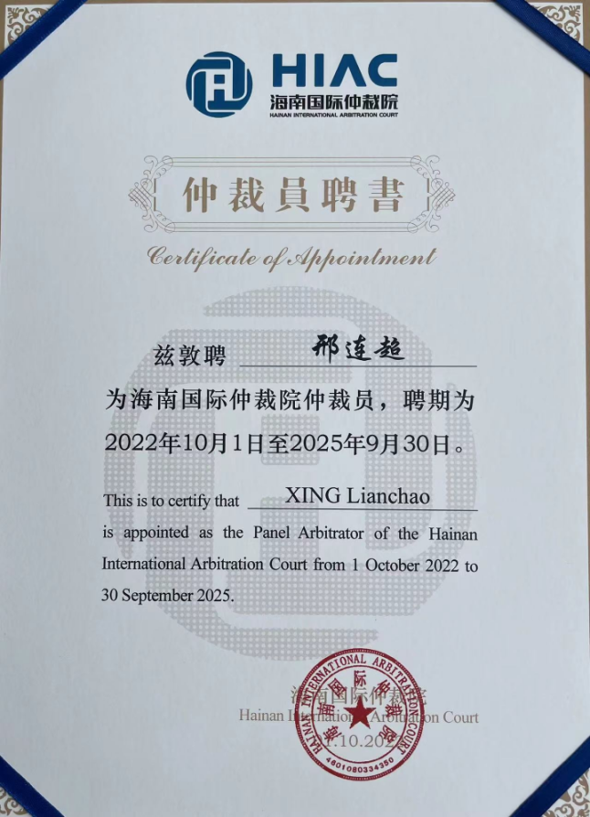 近日,经过组织推荐、资格审查、培训考核、网络公告等程序,根据《中华人民共和国仲裁法》和《海南国际仲裁院章程》的规定,海南国际仲裁院第一届理事会第三次会议审议通过《海南国际仲裁院2022年度拟增聘仲裁员名单》,决定增聘四川明炬律师事务所合伙人邢连超等128人为仲裁员,聘期到2025年9月止。