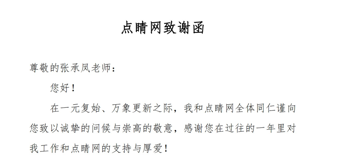 2023年1月13日,四川明炬律师所合伙人、婚姻家事与私人财富管理法律业务部部长张承凤收到“点睛网”致谢函。