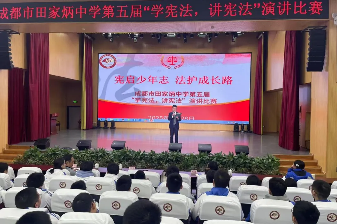 为切实贯彻习近平新时代中国特色社会主义思想,落实党的二十大精神及国家“八五”普法规划,成都市田家炳中学高中部于3月28日隆重举行了以“宪启少年志,法护成长路”为主题的“学宪法,讲宪法”演讲比赛。本次活动特邀成都市律师协会青年律师工作委员会副主任,明炬党委委员、团委书记、高级合伙人胡基洋担任评委。
