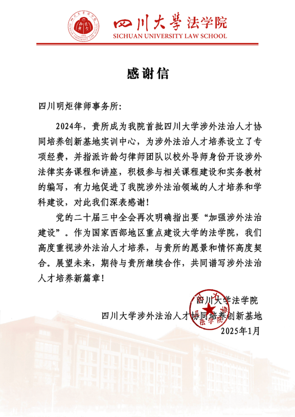 近日,明炬与四川大学法学院合作开设的“国际金融法案例研究”系列必修课程圆满结课。该课程是明炬根据四川大学的教学计划安排及管理要求,结合涉外法治实践需求,充分发挥自身在涉外法律服务领域的实务经验,与四川大学共同定制的高质量法律实务课程。凭借卓越的实务经验和扎实的课程内容,明炬赢得了四川大学法学院及四川大学涉外法治人才协同培养创新基地的高度认可,并收到了双方联合发出的感谢信,以表彰明炬在涉外法治人才培养方面的突出贡献。