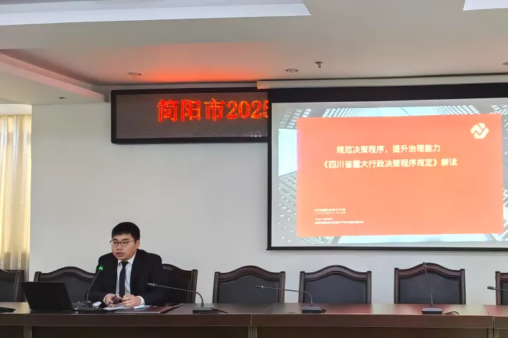 2025年2月24日上午,受简阳市司法局邀请,明炬白强律师团队王黎律师为简阳市级部门、街道办事处等相关单位开展“《四川省重大行政决策程序规定》解读”专题培训。本次培训旨在贯彻落实2025年1月24日四川省人民政府印发的新版《规定》(川府发〔2025〕4号)精神,推动决策程序规范化、法治化,助力法治政府建设。市司法局审查科科长尧英主持会议。