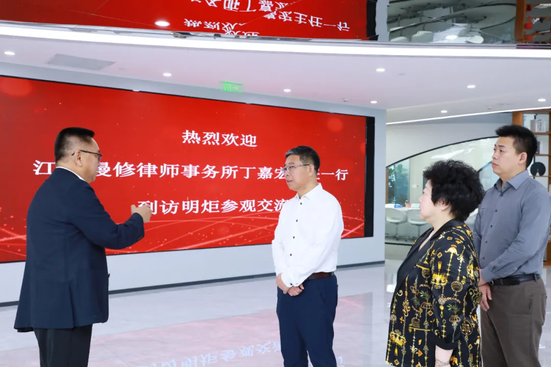 2024年5月29日,江苏漫修律师事务所管委会主任、创始合伙人丁嘉宏,创始合伙人王卉青,副主任王可炜一行3人到访明炬参观交流。明炬党委书记、主任王宗旗,党委副书记、管委会委员白强,执委会委员杨勇、张杨热情接待。