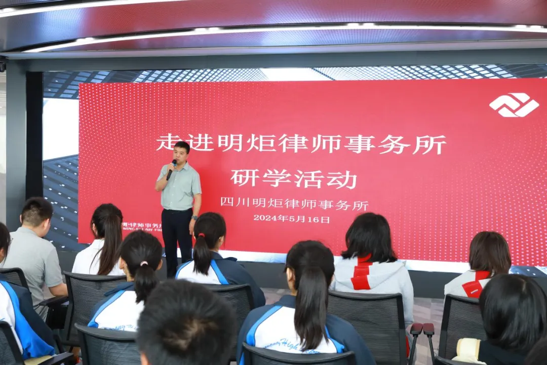 2024年5月16日,四川天府新区香山中学、华阳中学研学团师生一行160余人到明炬研学访问。明炬公司法律业务部副部长、高级合伙人张浩,教育培训委员会副主任、合伙人林超,合伙人高原羚等给予热情接待。