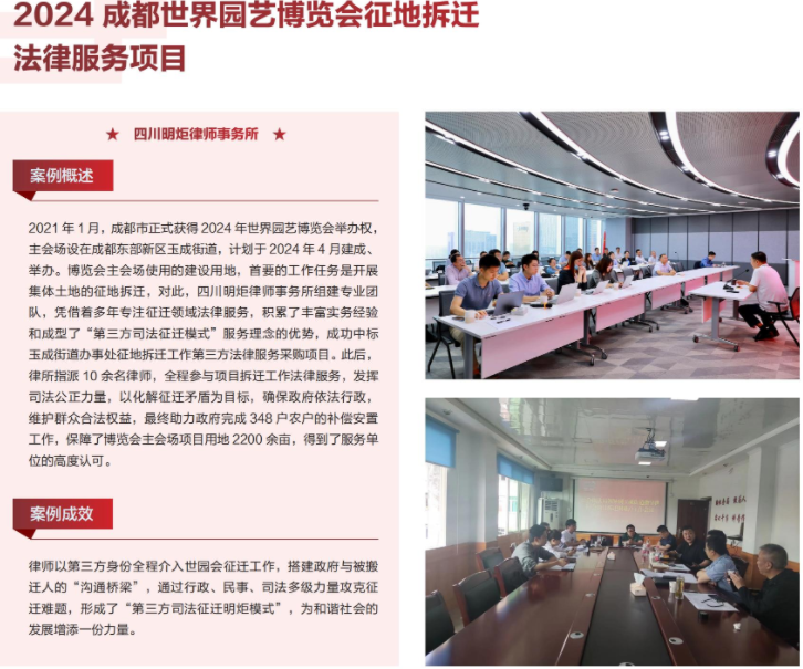 2023年7月1日,四川省律师行业十佳典型案例发布活动在蓉举办,明炬2024成都世界园艺博览会征地拆迁法律服务项目入选服务重大项目十佳典型案例。以下为案例详情: