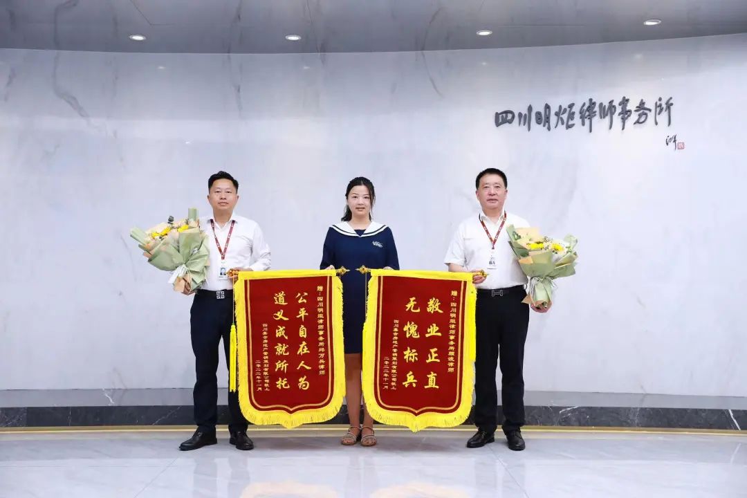 近日,四川嘉合房地产营销公司负责人将两面写有“公平自在人为 道义成就所托”“敬业正直 无愧标兵”的锦旗送到明炬,并通过一封感谢信向颜波、邱万兵律师表达了最真挚的感谢。