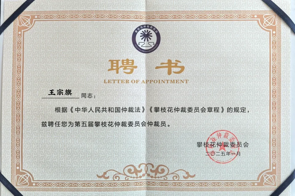 明炬总分所王宗旗、刘栓宁、邓春生、白海律师受聘为攀枝花仲裁委员会仲裁员