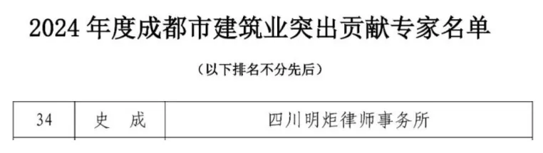 史成律师荣获“成都市建筑业突出贡献专家”称号