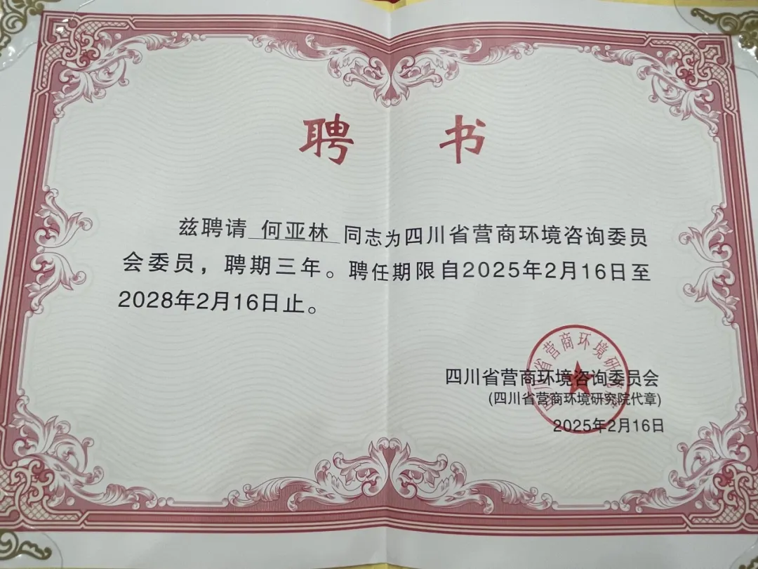 高级合伙人何亚林受聘为四川省营商环境咨询委员会委员