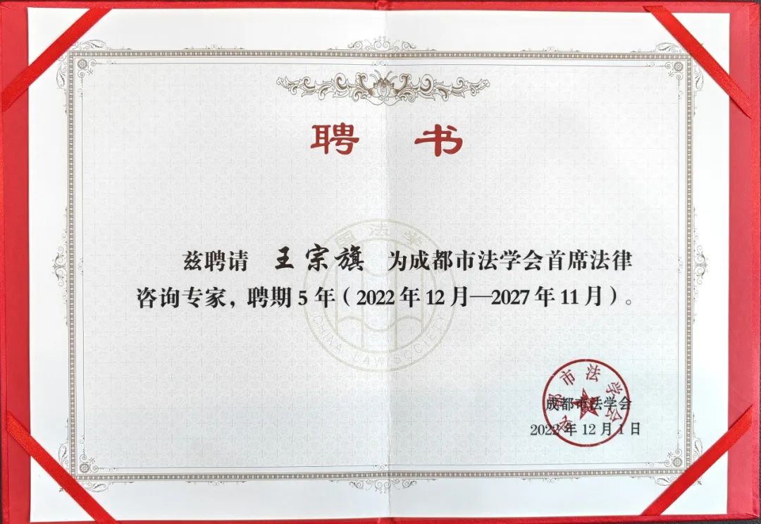 祝贺!明炬王宗旗、梁开阔、陈自强、漆明律师受聘为成都市法学会首席法律咨询专家